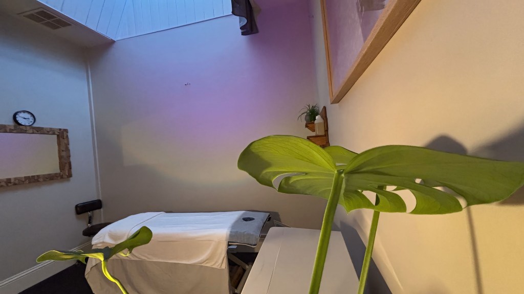The massage room was peaceful and quaint with a high ceiling above the massage table allowing for natural lighting. There was also peaceful music and pink noise which added to the serenity of the place.